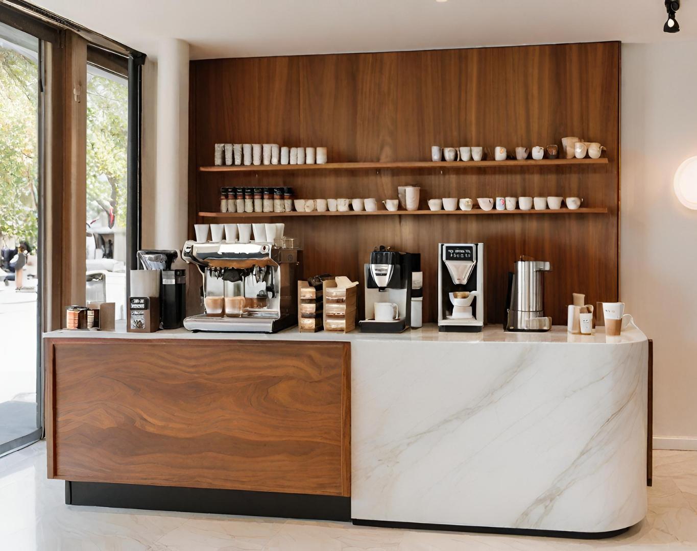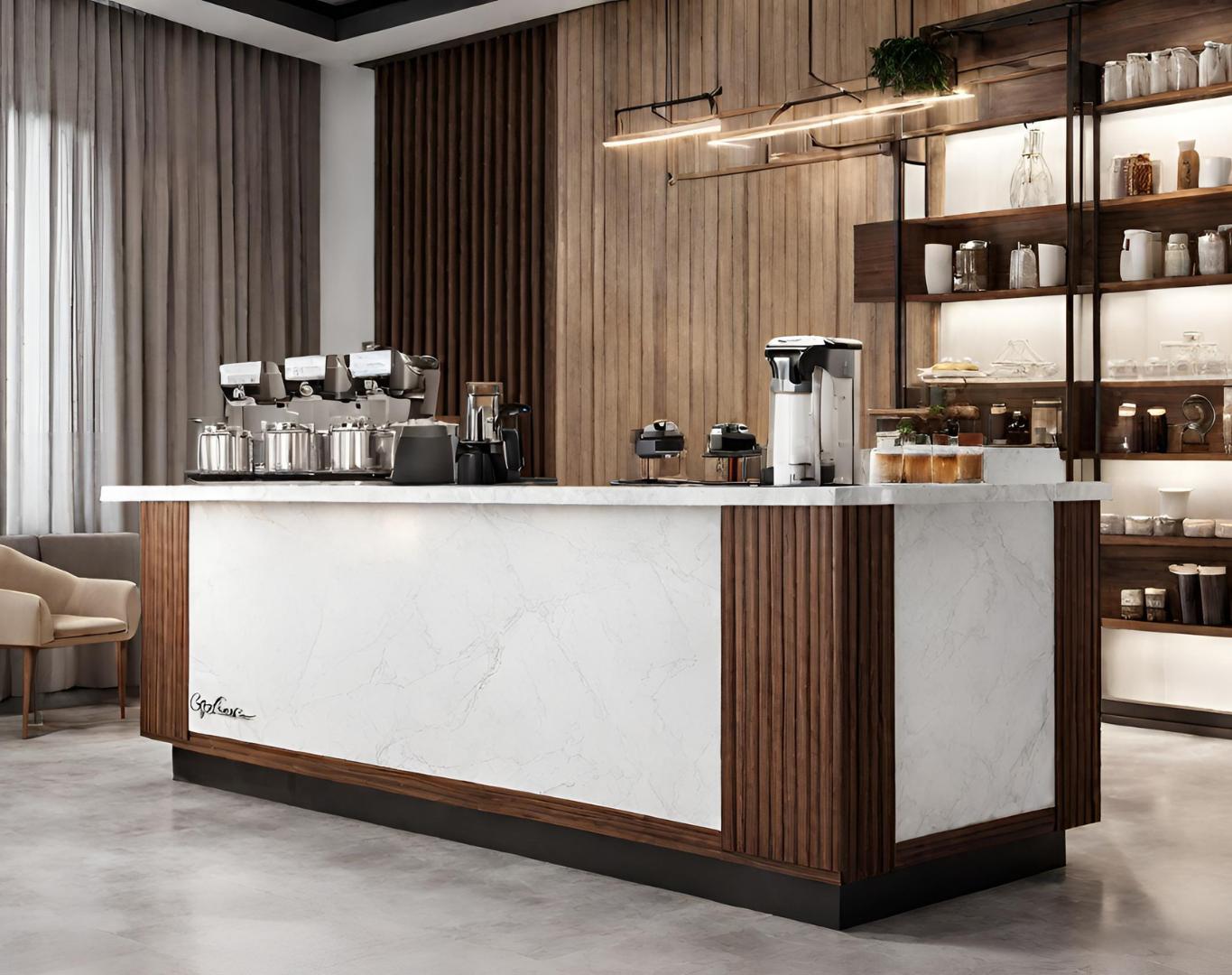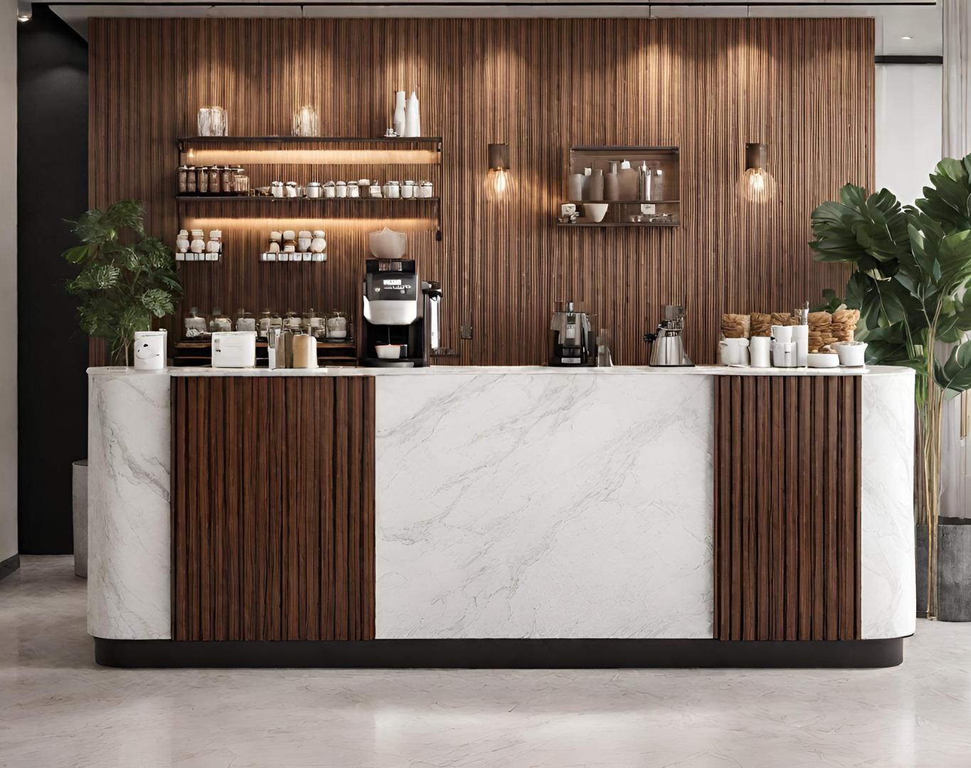 كوفي كورنر، زاوية القهوة الرائعة المصنوعة من الخشب الطبيعي والرخام البديل، تجسد الفخامة والجمال في تجربة القهوة الخاصة بك.